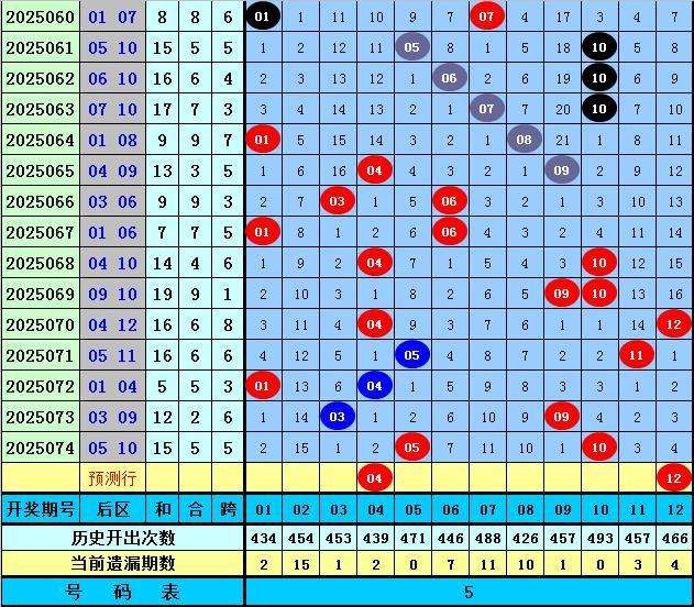 前区第一位:在历史第075期同期开奖中分布范围在01-13区段,平均值为5,奇偶比为12:6,目前奇数号码遗漏了1年,今年第075期注意奇数号码回补,关注号码07。