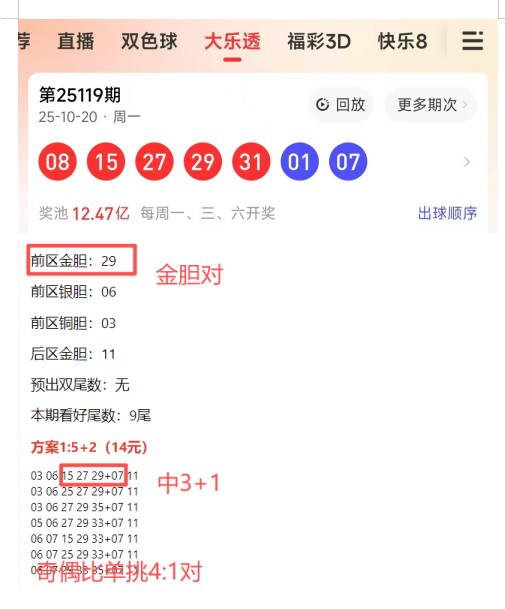 首先回顾大乐透上期开奖结果:08 15 27 29 31+01 07,上期金胆29对,奇偶比单挑4:1对,单式命中3+1等
