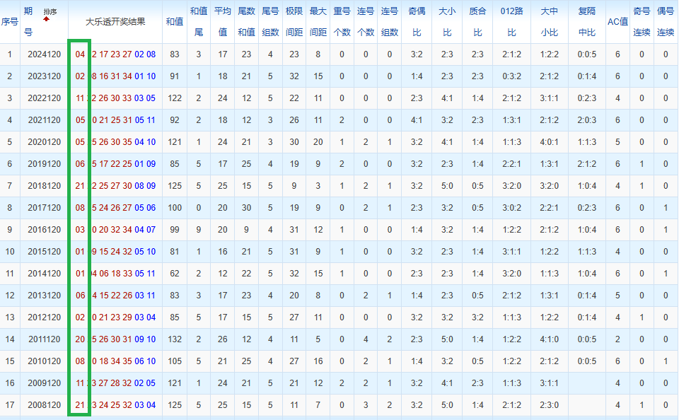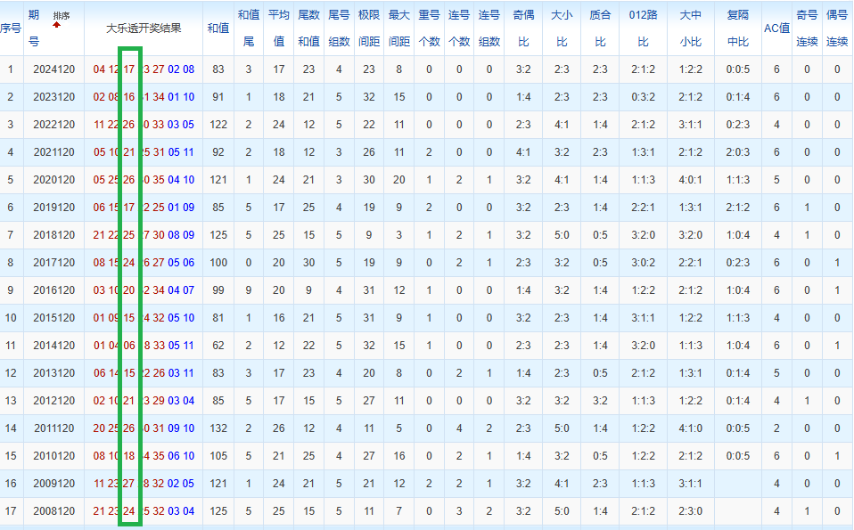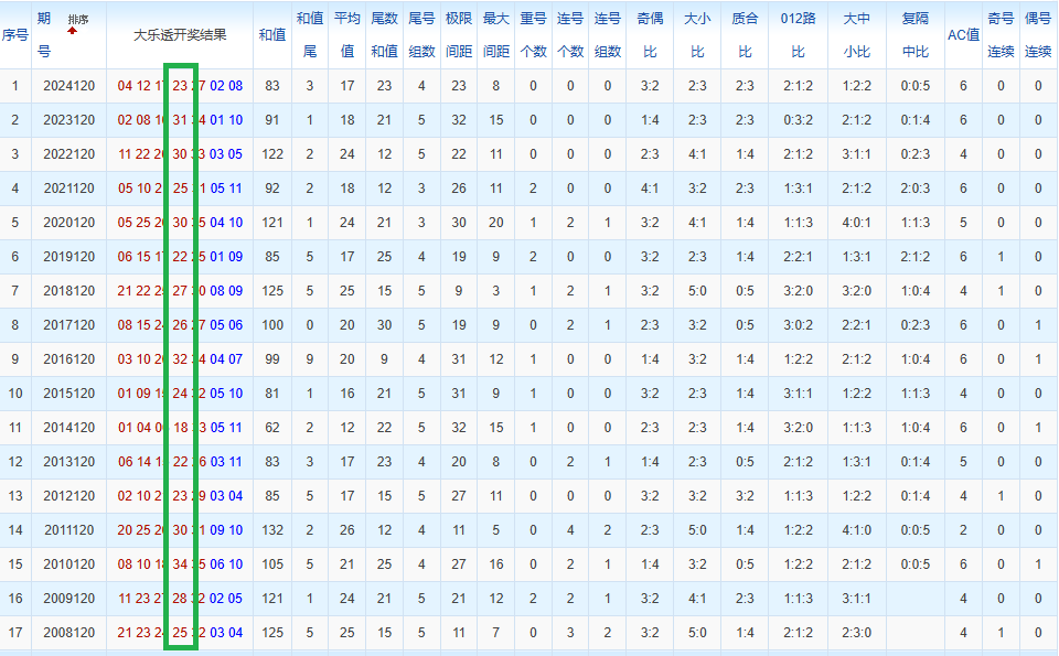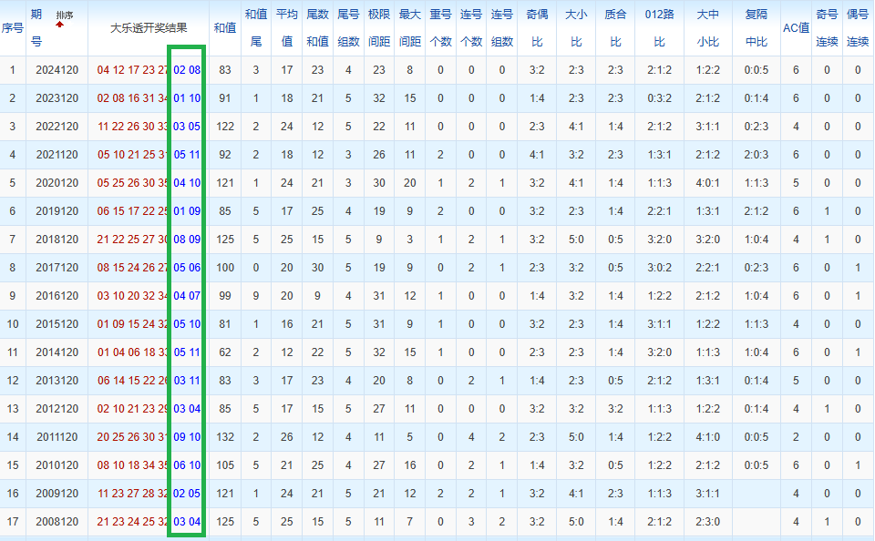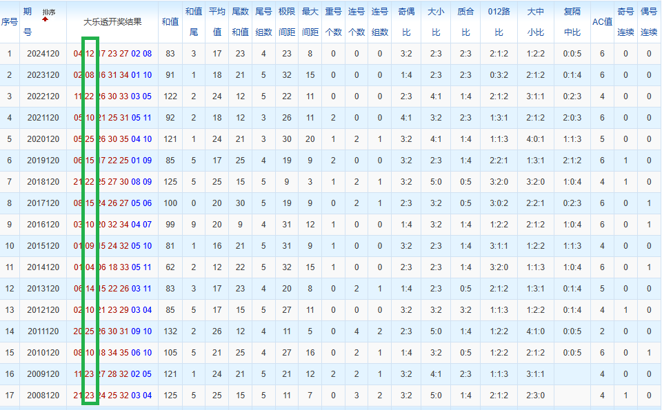 通过观察,我发现往年同期的开奖数据与本期号码之间存在显著关联。具体来说,在前区号码中,从第一位至第五位,通常会有约三个位置上的数字与往年同期相同位置的号码一致;而后区号码中,也有多期开奖结果直接包含了往年同期的数字。因此,我们可以借助往年同期各位置上的号码,作为分析本期开奖情况的重要依据。在此基础上,还可结合往年同期的其他相关条件,进行综合性的号码组合推荐。