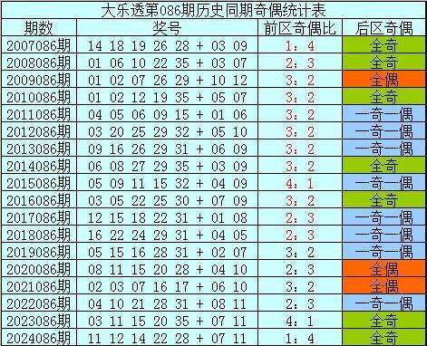 后区分析:在第086期历史同期开奖中,后区奖号奇偶比为22:14,最近5年同期后区奇偶走势为:全偶、全偶、一奇一偶、全奇、全奇,今年同期预计奇偶号码同出,关注两码06、09。