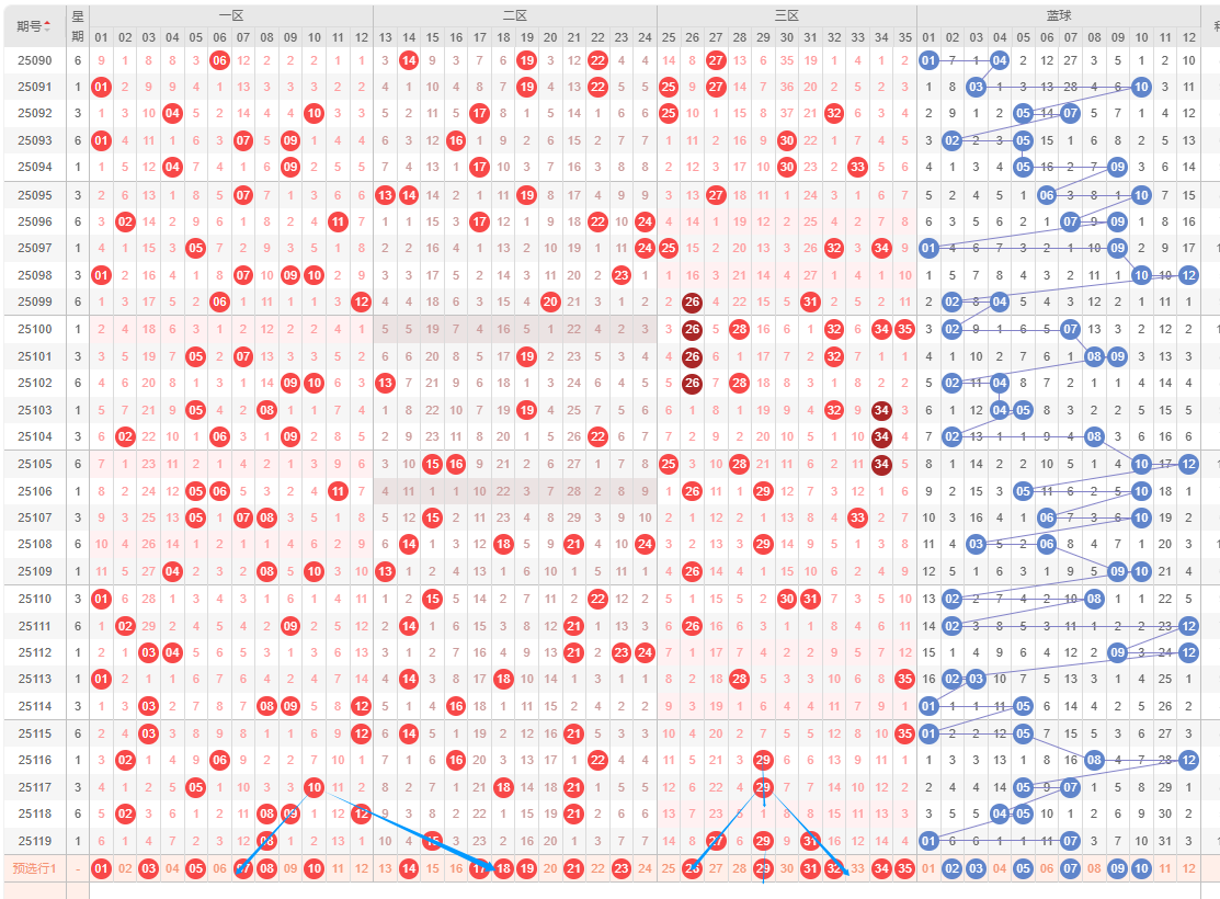推荐大底:一区:2-3-5-7-9,二区:14-16-17-19-23;三区:25-26-29-34-35;蓝区:2-3-5-9-12