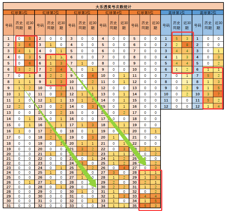 1、如上图,背景越深色,说明出号频率越高。