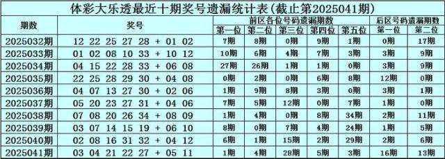 第2025041期奖号:03 04 21 22 27 + 05 11 ,各位号码遗漏期数为:1期、4期、28期、5期、3期 + 16期、13期。