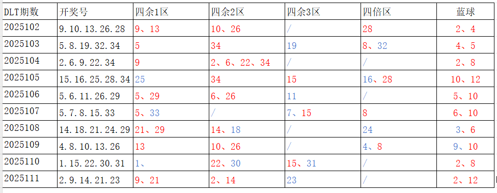 分享第一个数据分析:四分区统计数据。相对于传统的三分区,个人习惯使用四分区,就是把35个红球号码除以4,所得的余数分区如下: