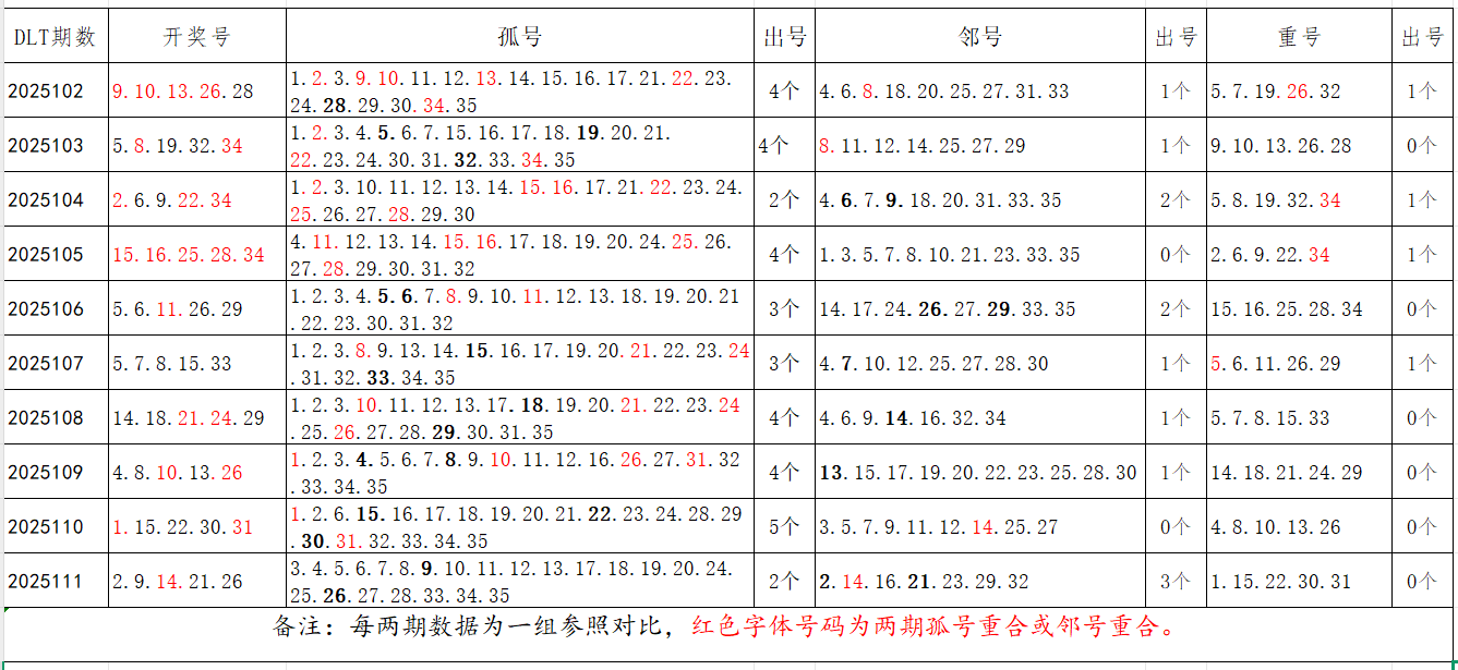 如图,以近两期数据为一组,进行对比分析,相同的孤号、邻号可能在下期开出。本期参考孤号:4.5.6.7.11.12.16.17.18.19.23.24.28.29.30.31.32.33.34.35;邻号:1.3.8.10.13.15.20.22.25.27。重点关注:孤邻号重合号码:***(会员专区可见)。个人分析,仅供参考。