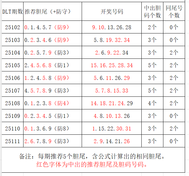 如图,每期推荐胆尾中出1-4个。上期推荐胆尾中出3尾3码!推荐胆尾是按照公式计算的顺序,不定位红球号码的顺序。本期推荐胆尾:2尾/5尾/1尾/4尾/0尾,加推防守胆尾+胆码号码:***(会员专区可见)。个人分析,仅供参考。