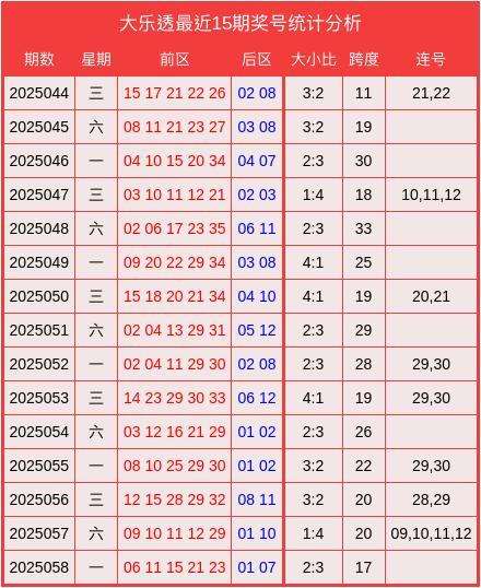 上期回顾:大乐透2025058期开出奖号:前区06、11、15、21、23,后区01、07。
