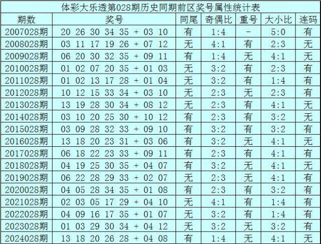 体彩大乐透第028期历史同期开出18次奖号,其统计详见下表: