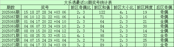 大乐透第25073期奖号为:01、04、17、33、34+03、09。其中前区和值为89,奇偶比为3:2,大小比为2:3。后区为一大一小、全奇组合。