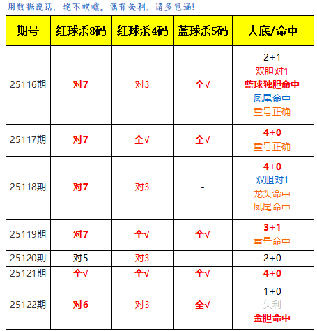 上期红球杀8码对6,免费文章杀4码全对,蓝球杀5码全对,上期红球命中3码,本期再接再厉!