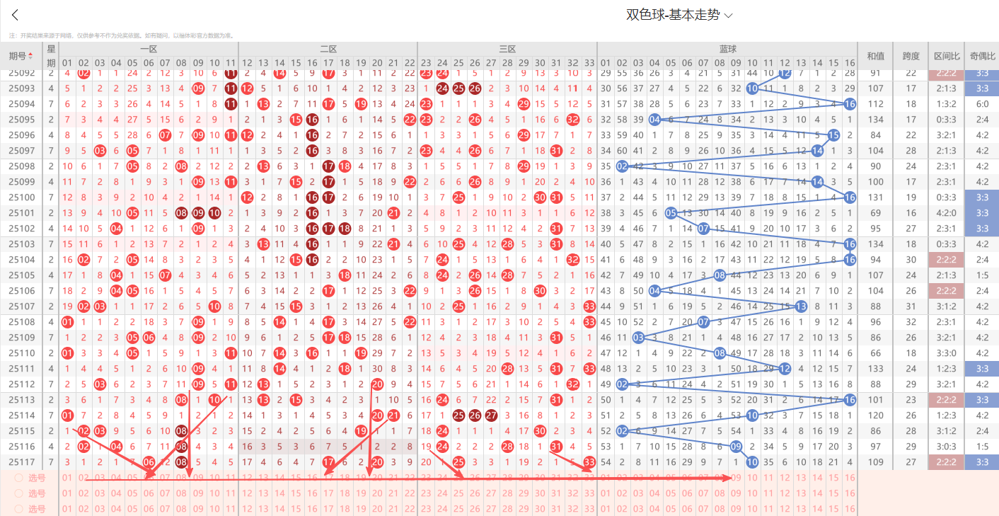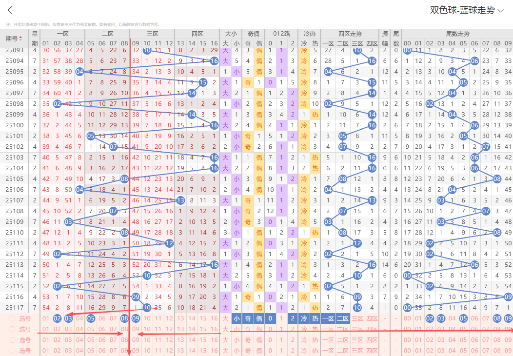 上期开出大号奇数09,从走势上号码整体分布结合折线运行轨迹本期蓝球重点关注小号出号,即五码02 03 05 08 09参考。有关更多详细选号思路以及号码组合搭配 我们15:00~17:30点有选号思路详细解析的直播节目欢迎大家前来一起探讨交流。