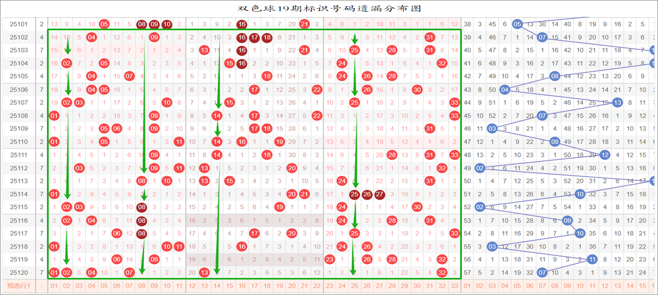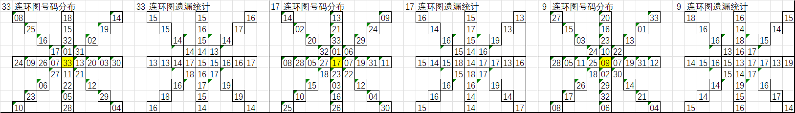由于数据量大,不一一统计,下图为各个号码分别在33、17、9连环图上的遗漏统计汇总图: