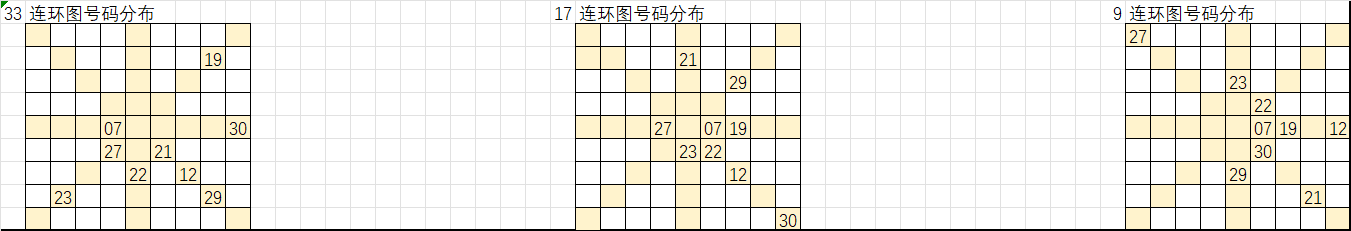 我的思路主要是统计分析九转连环图,彩虹官方平台上也有分布图,我们先来看看原理。九转连环图是宋代数学家杨辉的“幻圆”演变而来的,每个圆环、每条轴(不含中心数字)的和值均相等。经过各位前辈老师不断改进应用,形成了以中心数字为33、17、9的连环图,保持每个圆环、每条轴等和值的特点,这里要感恩古代文化的博太精深,也要感谢各位前辈推演应用的方法。