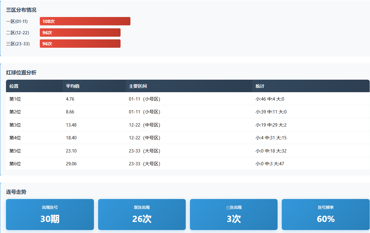 再把视角拉到六个位置来看,规律性其实更明显。第一位长期稳定在 01–11 这个小号区,它的平均值在 4.76 左右,小号占比高达 46次,几乎可以说锁死在这一段,很少往中大号跑;第二位也差不多,平均值 8.66,依旧是小号占主力,保持着一个相当稳定的节奏。