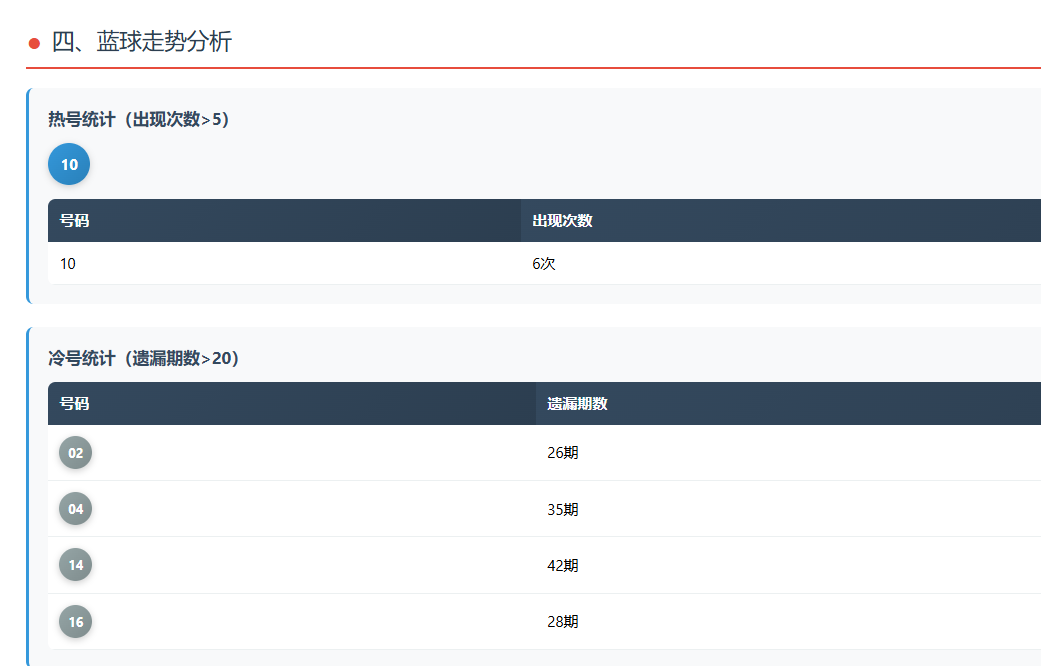 接下来讲蓝球。本期开出的是 06,属于中冷段号码。蓝球里真正算活跃的,是 10,近50期已经出现 6次,热度领跑。而 02、04、14、16 这些动辄二三十期没露面的号码,依旧处在“北极冻库”。这种缺位时间太长的号码反而不必追着看,常态是继续沉底。蓝区整体的近期观察,可以偏向中段的节奏波,像 06、08、09、10、11 这种中间值依旧是更有存在感的一档。