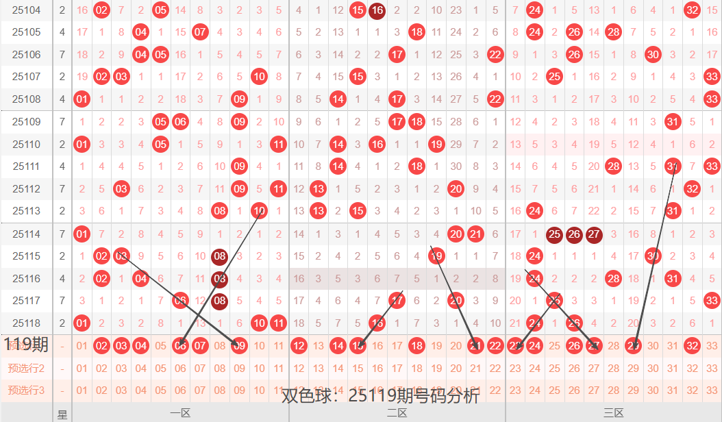 先介绍下上期开奖号码的基本情况,红球奇偶比:2:4,区间比:3:1:2,012路比:1:3:2,通过上期号码简单介绍,分享下25119期号码球个人认为的出号可能,供大家参考!