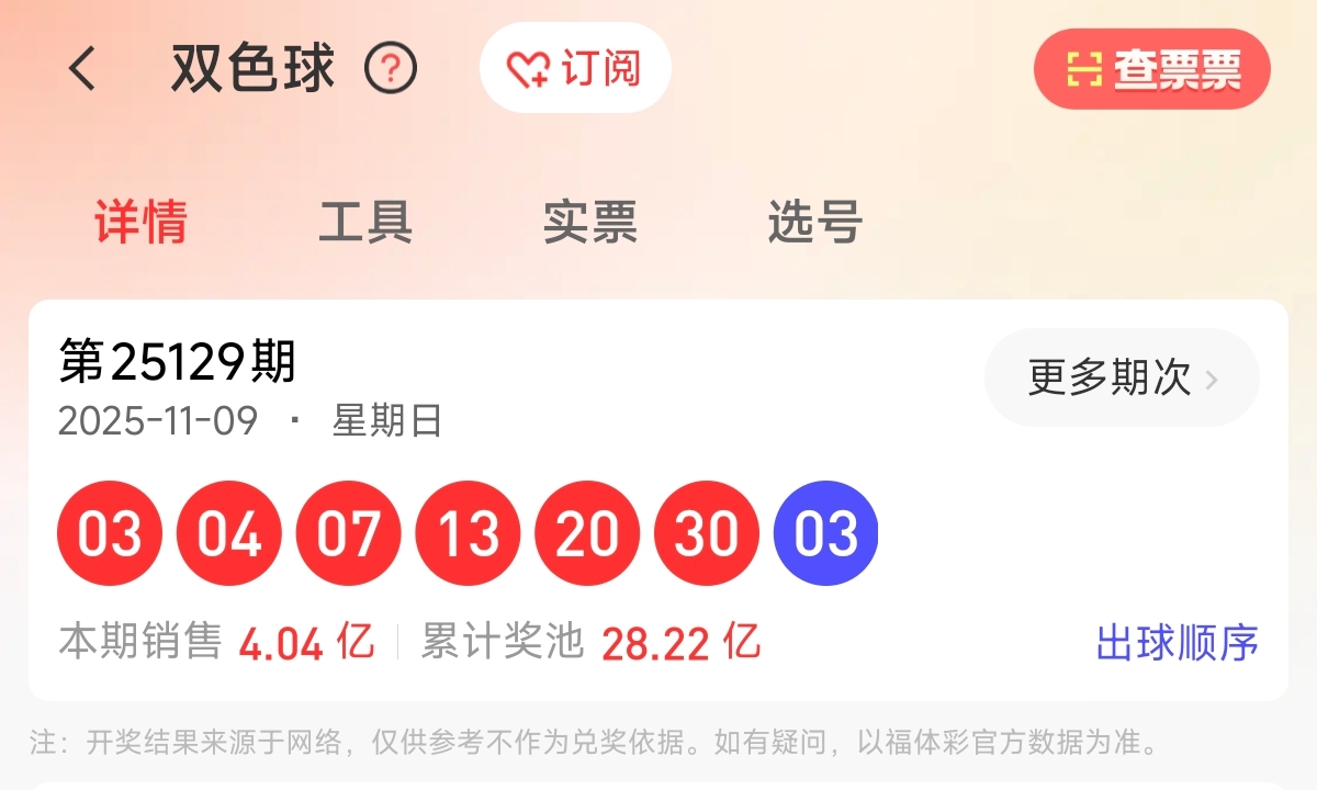 首先让我们回顾一下上期双色球25129期的开奖号码为03、04、07、13、20、30,蓝球03。和值77,跨度27,区间比为3:2:1,奇偶比为3:3。