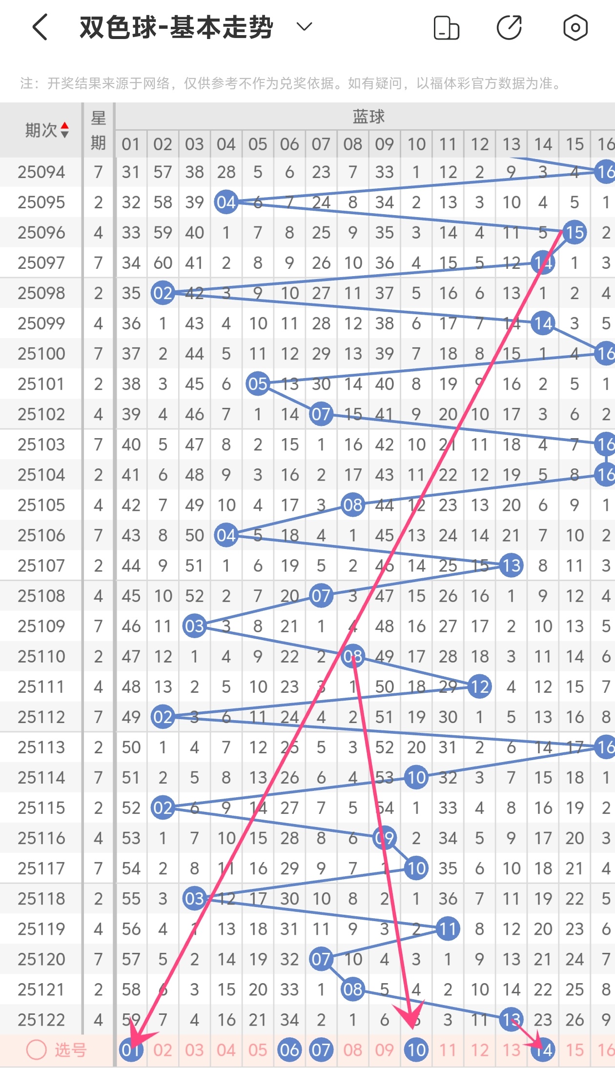 上期蓝球开出13,本期我们可以从上面走势图中看到选号的思路,01为斜连走势,10为斜连走势,14为分边走势,综合以上分析本期蓝球推荐01 04 08 10 13