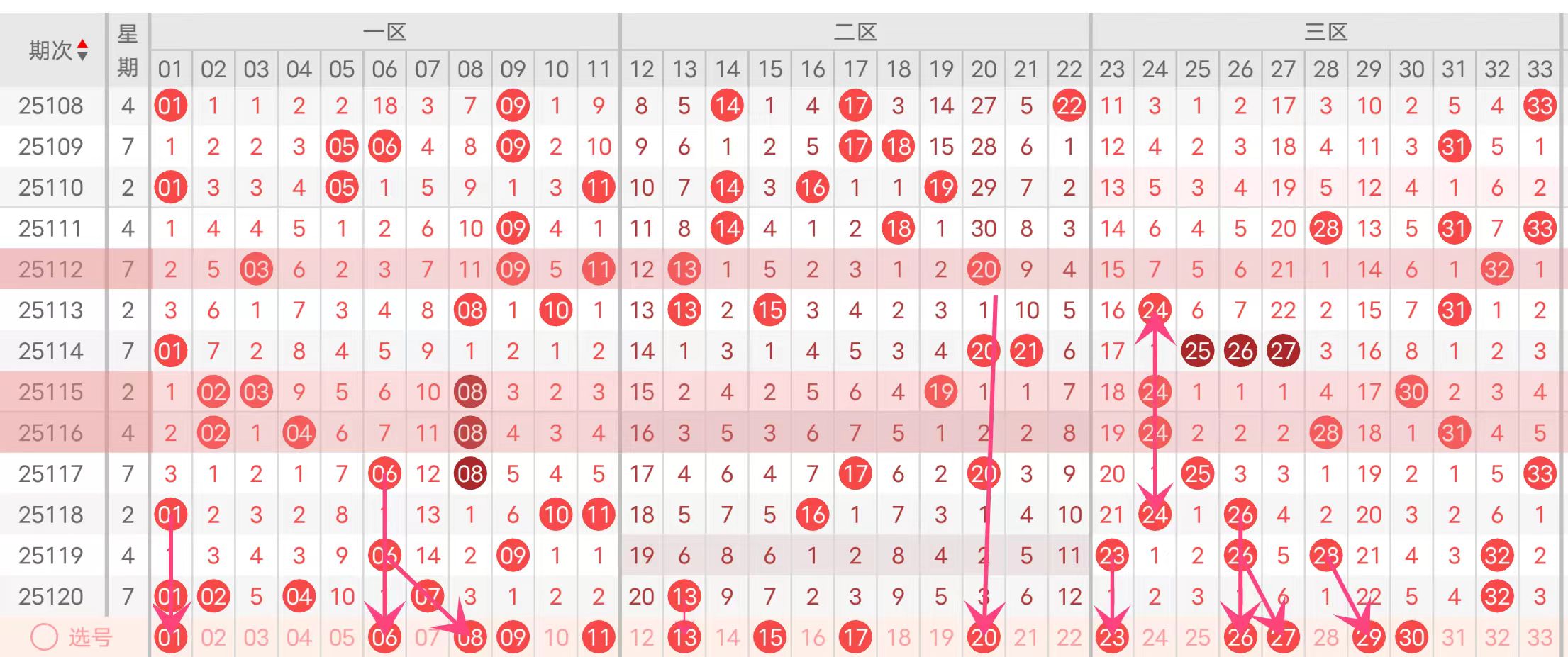 红球三区比:本期红球三区比为 4:1:1,近五期红球区间比分别为 3:0:3 ,2:2:2 ,3:2:1 ,2:0:4 ,4:1:1 本期预计红球三区比为 3:1:2。