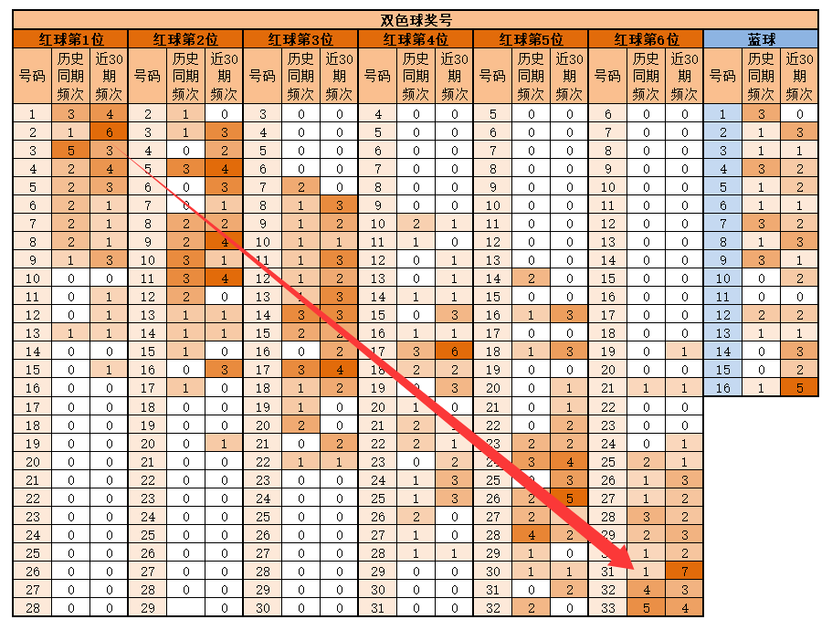 第6位,基本在24-33之间,历史同期频次最多的33;近30期,频次最多的为31,明显特征是合数奇数优势;推荐重点28-28-30-31-32-33。