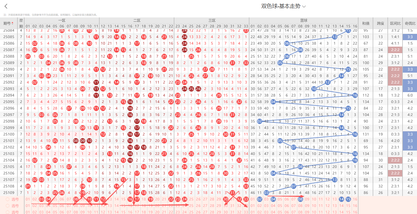 1、红球特征分析:(通过整体走势不难看出每期开奖号都具备以下明显的特征点)
