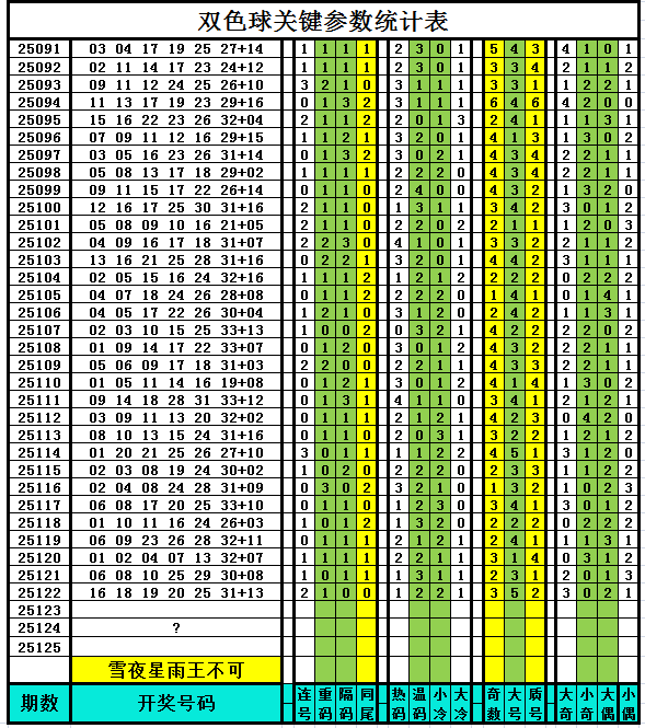 以下是作者手工统计的双色球关键参数统计表,对喜欢参数分析、过滤缩水、选号胆杀的技术性双色球爱好者有所帮助,其它读者可略过不看。