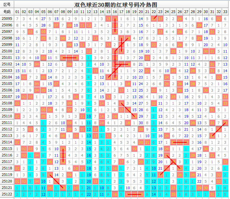 双色球近30期的红球号码冷热图 (数字为遗漏期数,蓝色标记的为遗漏超过10期的大冷号)