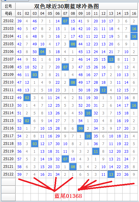 蓝球本期有热蓝9枚,冷蓝7枚,蓝球热码数量稍多。上期开出冷蓝,这是连续4期开出,由于近期蓝球冷热交替开出规律不明显,本期蓝球冷热难定。