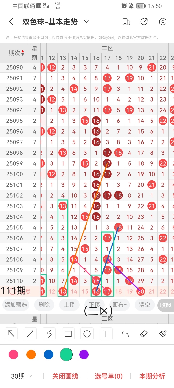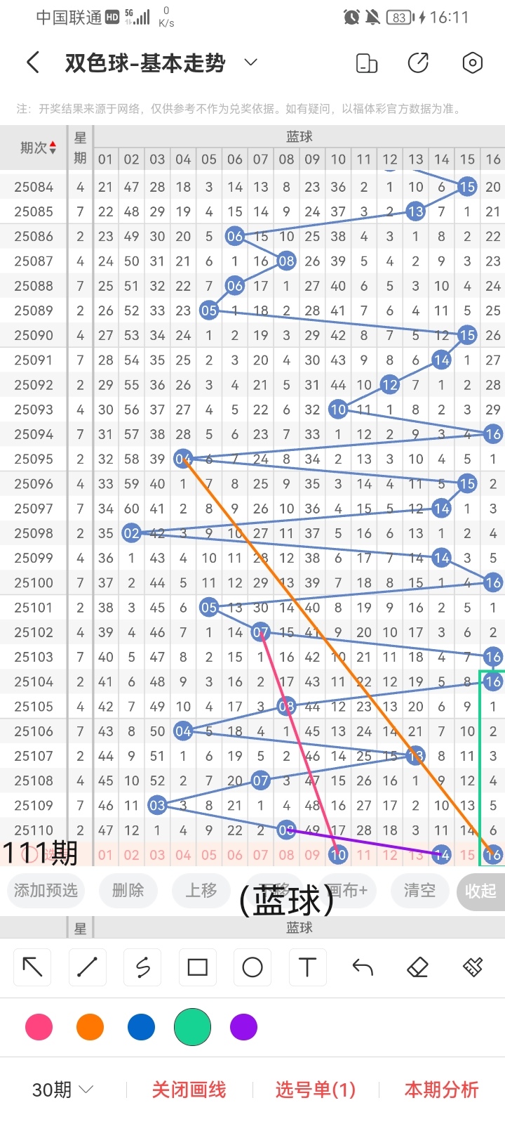 小梁根据图中画线思路,最后给大家汇总提供一下本期红球、蓝球数据,供大家参考: