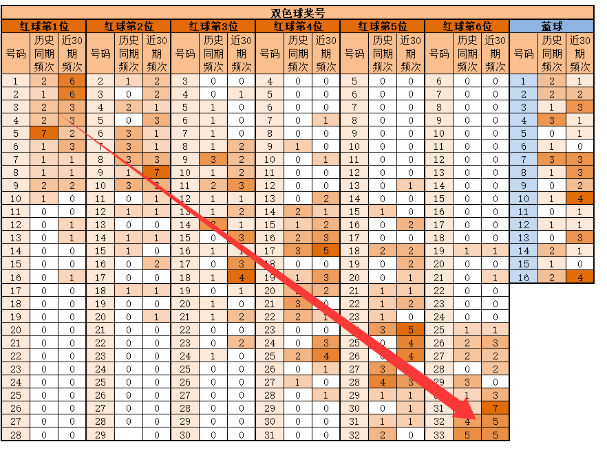 第5位,基本在16-31之间,历史同期频次最多的为28;近30期,频次最多的为24,明显特征是偶数优势;推荐重点22、24、25、26、27、28。