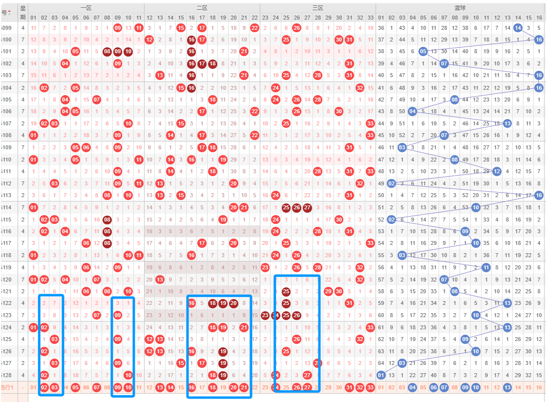 蓝球,历史同期频次最多的为4-7;近30期,频次最多的为10-16,明显特征是1路优势;推荐重点3-4-7-8-10-13-16。