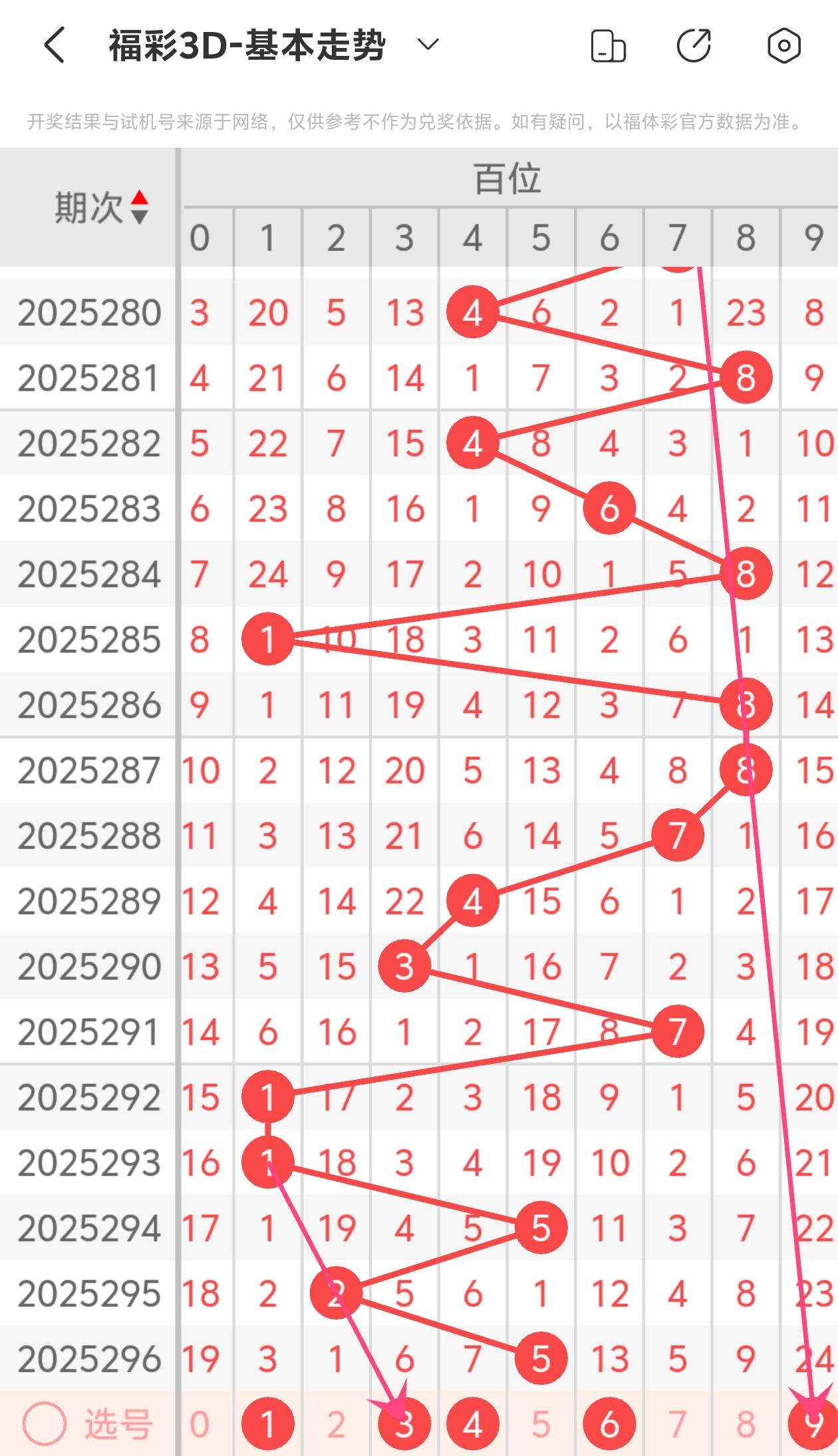 上期百位开出5,本区与上期的跨度为3,本期我们可以从上面走势图中看出选号的思路,3为斜连走势跨度为二,4和6为分边走势,9为斜连走势跨度为四,综合以上分析,本期百位推荐:13469