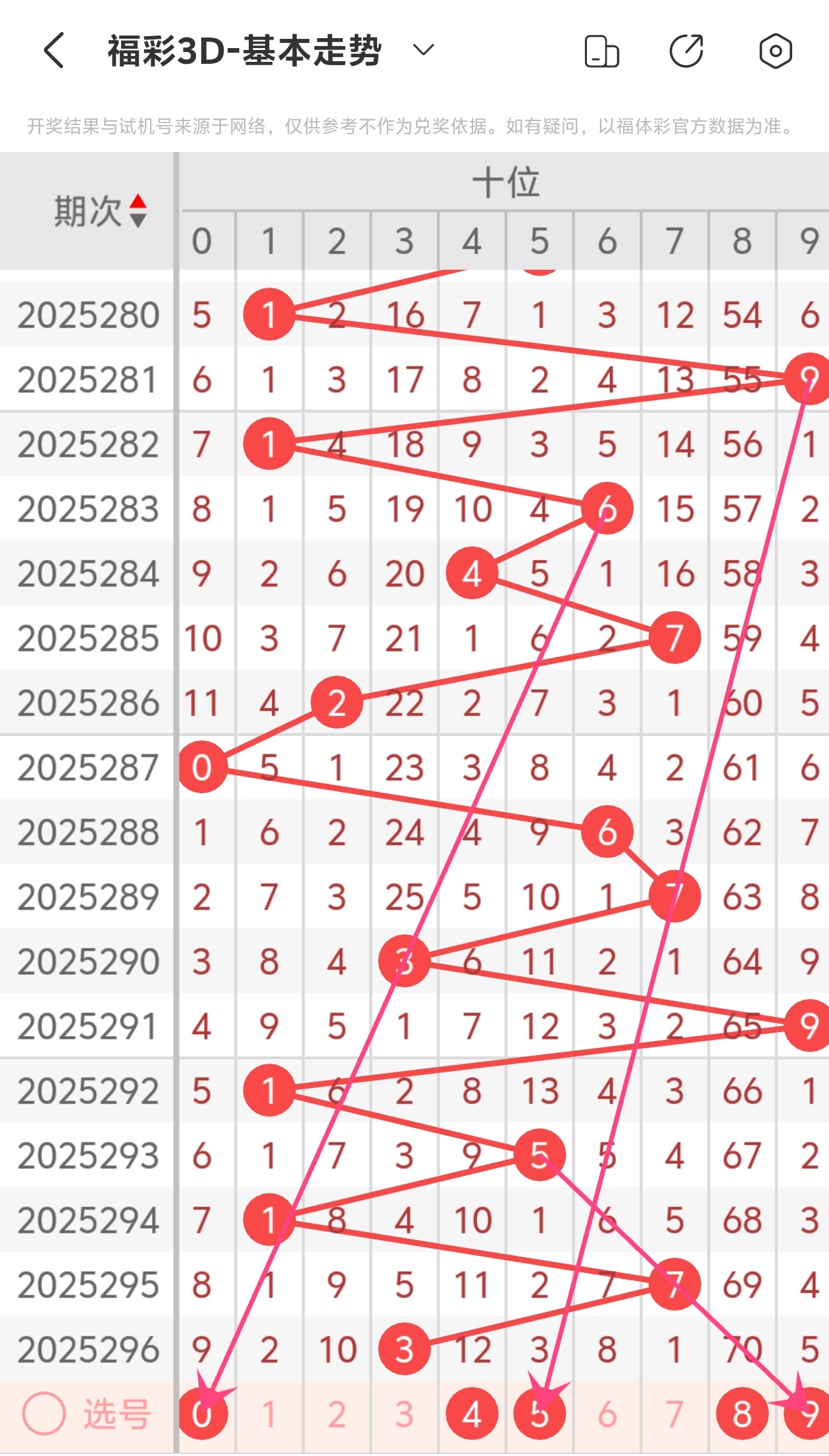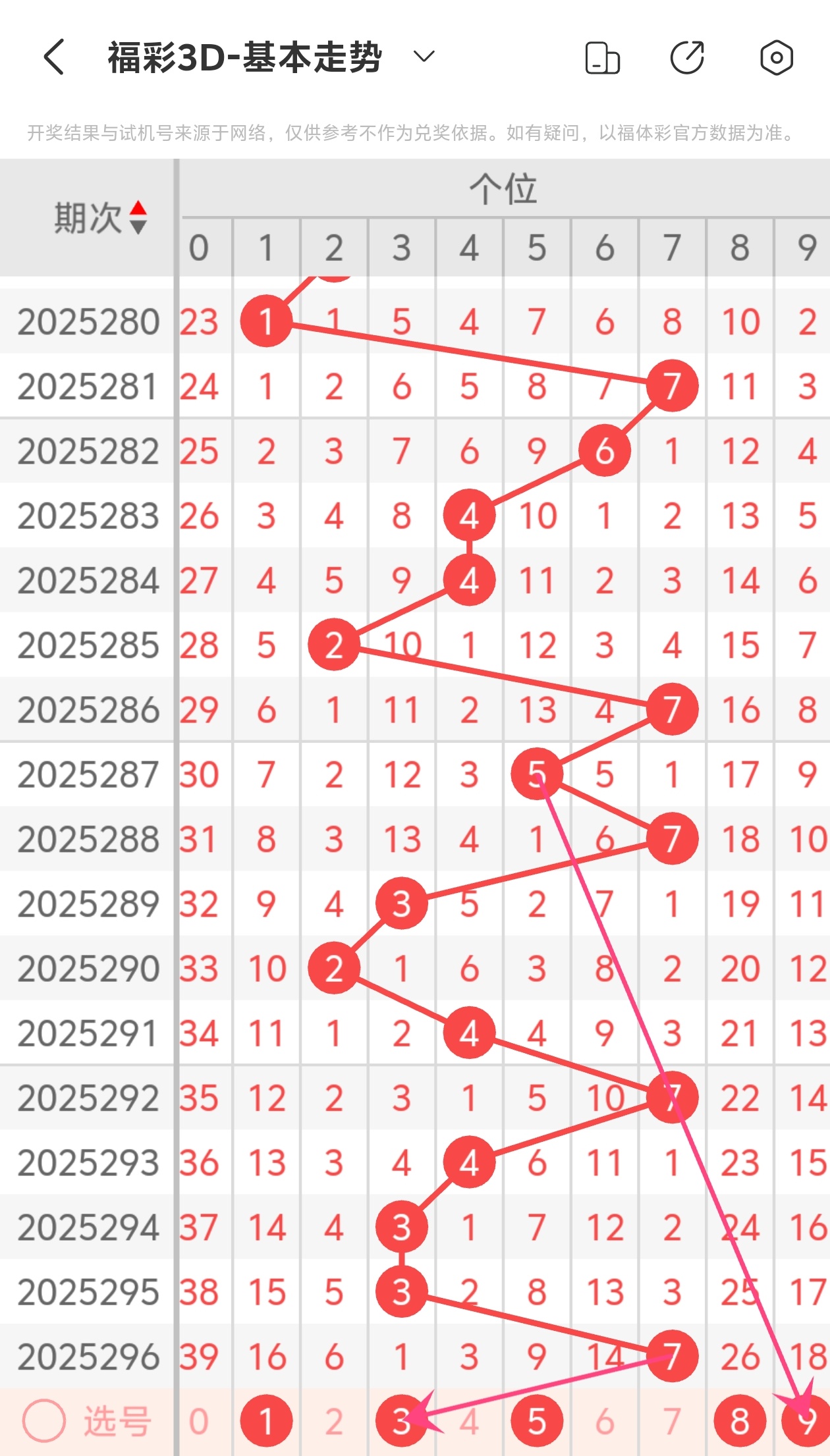 上期个位开出7,本区与上期的跨度为4,本期我们可以从上面走势图中看出选号的思路,3为隔期回补走势跨度为四,9为斜连走势跨度为二,综合以上分析,本期个位推荐:13589