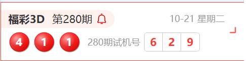 福彩3D第280期开奖结果为:411