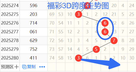 2)我们来看跨度;还是以276期——280期为例,如图 依次是66753跨度,按照路数转换关系来看,那么跨度我们暂定369258跨,本期个人比较看好 8 4跨。