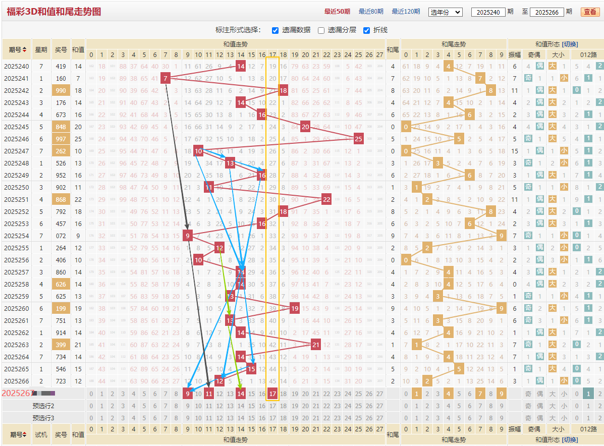 上期开出723和值12和,没开出顺线下来16和值那本期也不用考虑,可以直接排除,近期开出和值10-14-14-13-19-13-14-21-14-15-12,连续两期开出2路尾,本期奇数和值比较好,除3余0和值,大家看蓝色箭头三等格16-13-10和下面15-12-9本期9和值值得配号,241期7和值,254期9和值,267期也是等格这个11和值不错的,本期个人看好147尾,综合上述分析267期推荐和值:7 9 11 14 17 15 重点:7 9 11 14 17