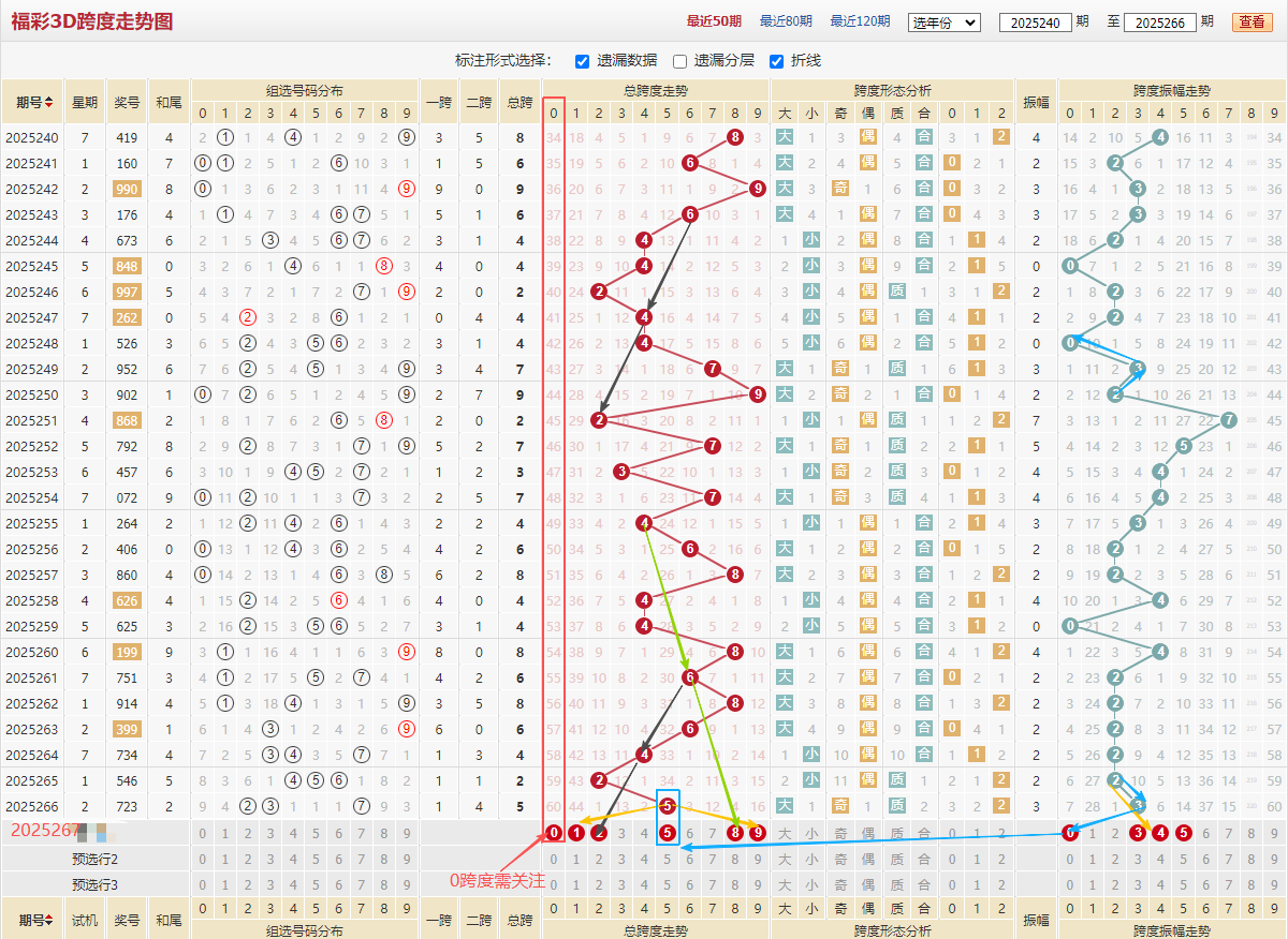 上期开出质跨5跨,近期跨度开出468 448 686 425,上期开出遗漏34期质数跨5跨,11期没开出奇数跨了上期也开出 ,这个0跨近期可以考虑,从振幅角度看4振幅走234斜线三连 对应1和9跨度,大家看黑线所示6-4-2很爱隔期开出,如果从振幅看本人更喜欢这个23振幅走0振幅,今天继续开5跨度。 267期推荐跨度:95623