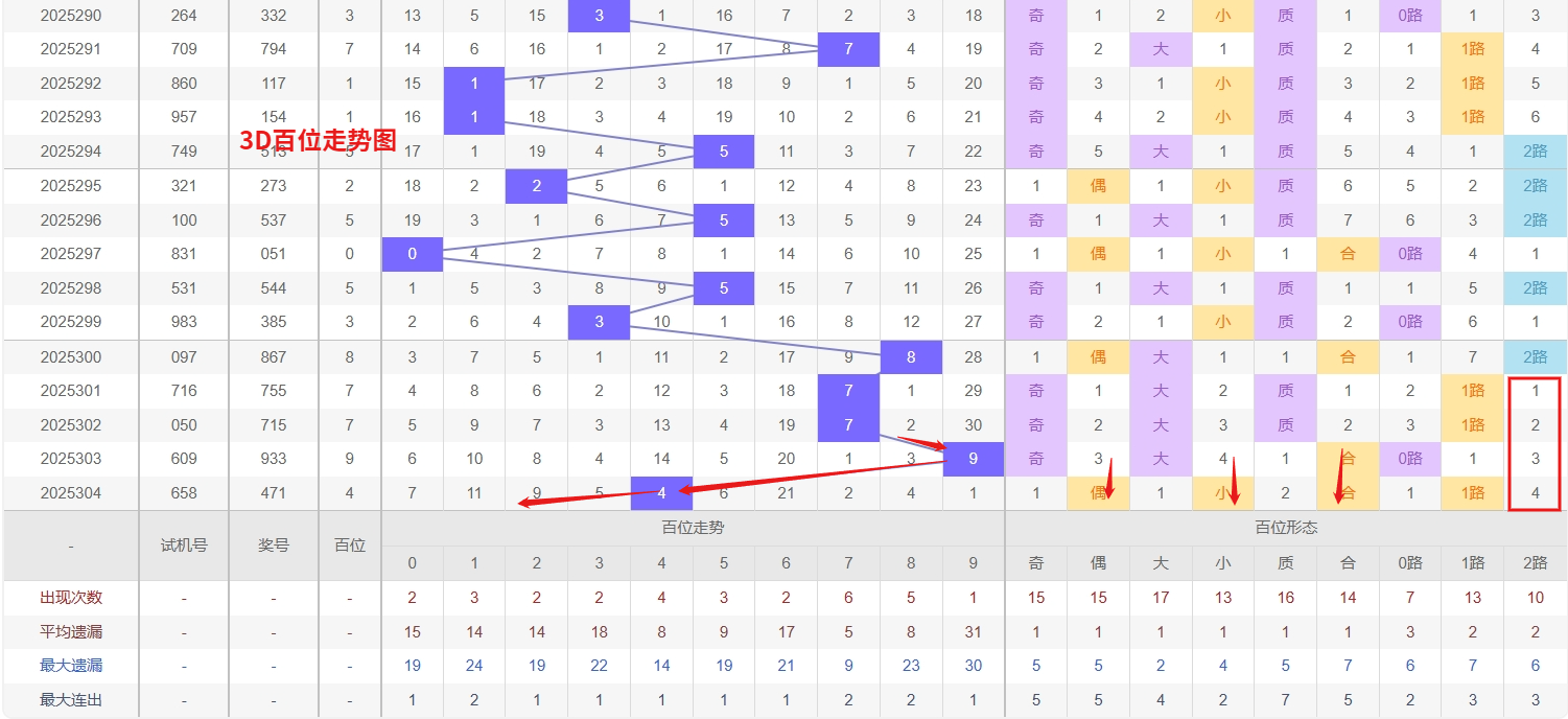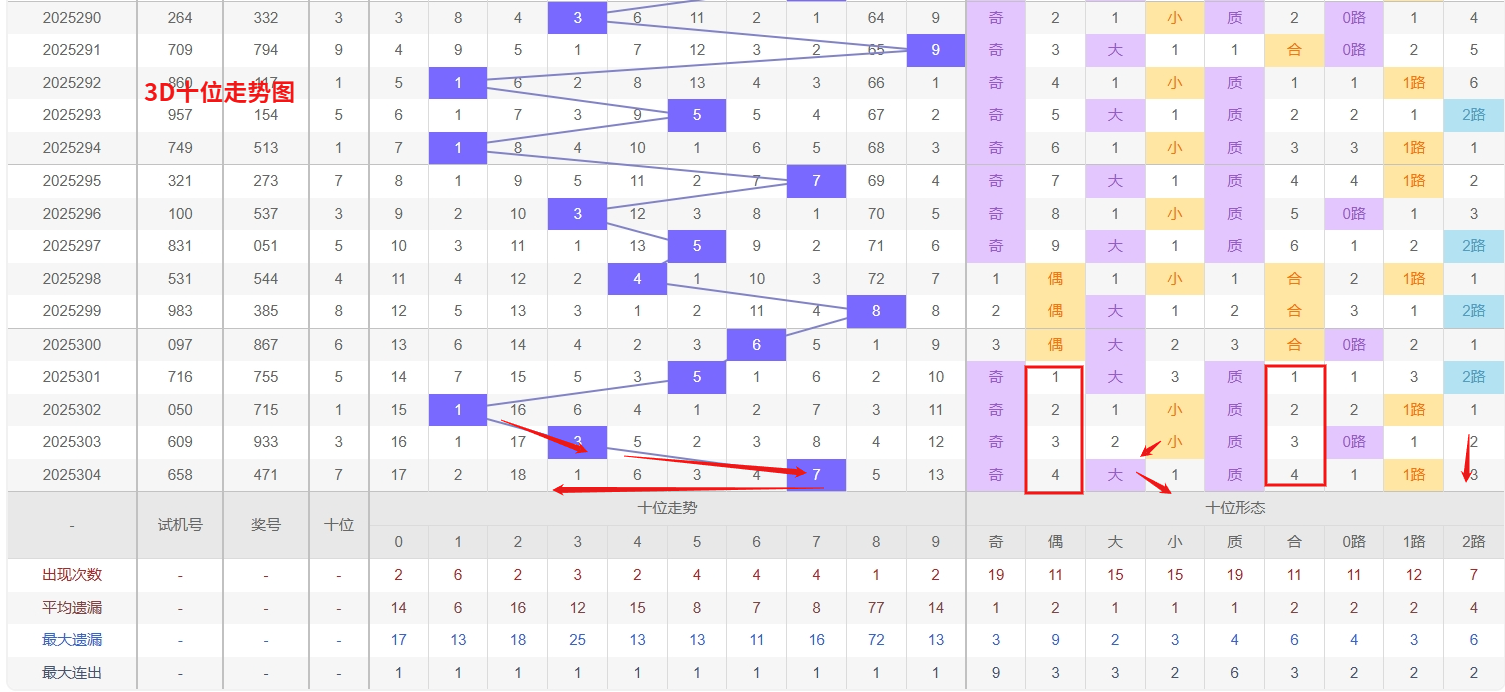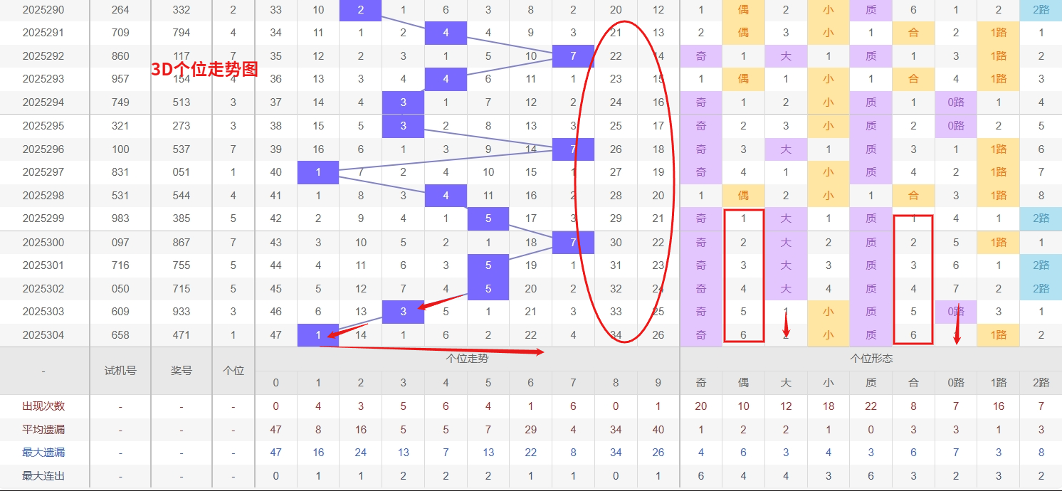 福彩3D个位分析:第2025304期个位开出号码1属于小奇数前端,从以上个位走势图中可以看出近100期的大小比约为46:54奇偶比约为52:48大小奇偶数据上有点差异有需求但不是太明显,不太好看这时就要借助连线走势和遗漏数据来帮助我们缩水号码。上期个位落号“1”小奇数1路号码球,号码开出了2振幅,连续多期的大振必被小振幅取代幅符合我们的预期,那么本期我们在个位考虑振幅走势走前依然要转变思路考虑大振幅,具体考虑(2-5)个振幅是我们主要的方向,那么在对个位落号情况进行系统的分析时我们可以明显的看到个位号码走势呈现大范围震荡,尤其是在号码的落位特点上表现的尤为突出,那么本期我们在个位分析时就要注意号码的风险,避免出现踏空。近期3D个位走势分析,数字0和8已分别遗漏长达47期和34期,形成了极为显著的冷态。从概率均衡与回补规律来看,这种极端冷态持续越久,其反弹开出的动能就越强,尤其数字0已严重偏离理论出现频率,近期需高度关注其强势回补的可能。与此同时,数字4正呈现明确的热出态势,热号往往具备一定的持续惯性,因此福彩3D第2025305期个位看好40689。