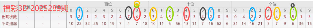 2025286期开奖号码827,我们可以看出近30期百位8出现3次,十位2出现5次(较288期减一),个位7出现4次。