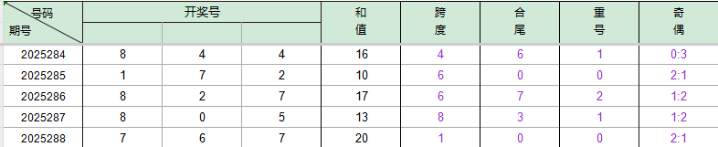 2025287期开奖号码805,我们可以看出近30期百位8出现4次,十位0出现3次,个位5出现4次。