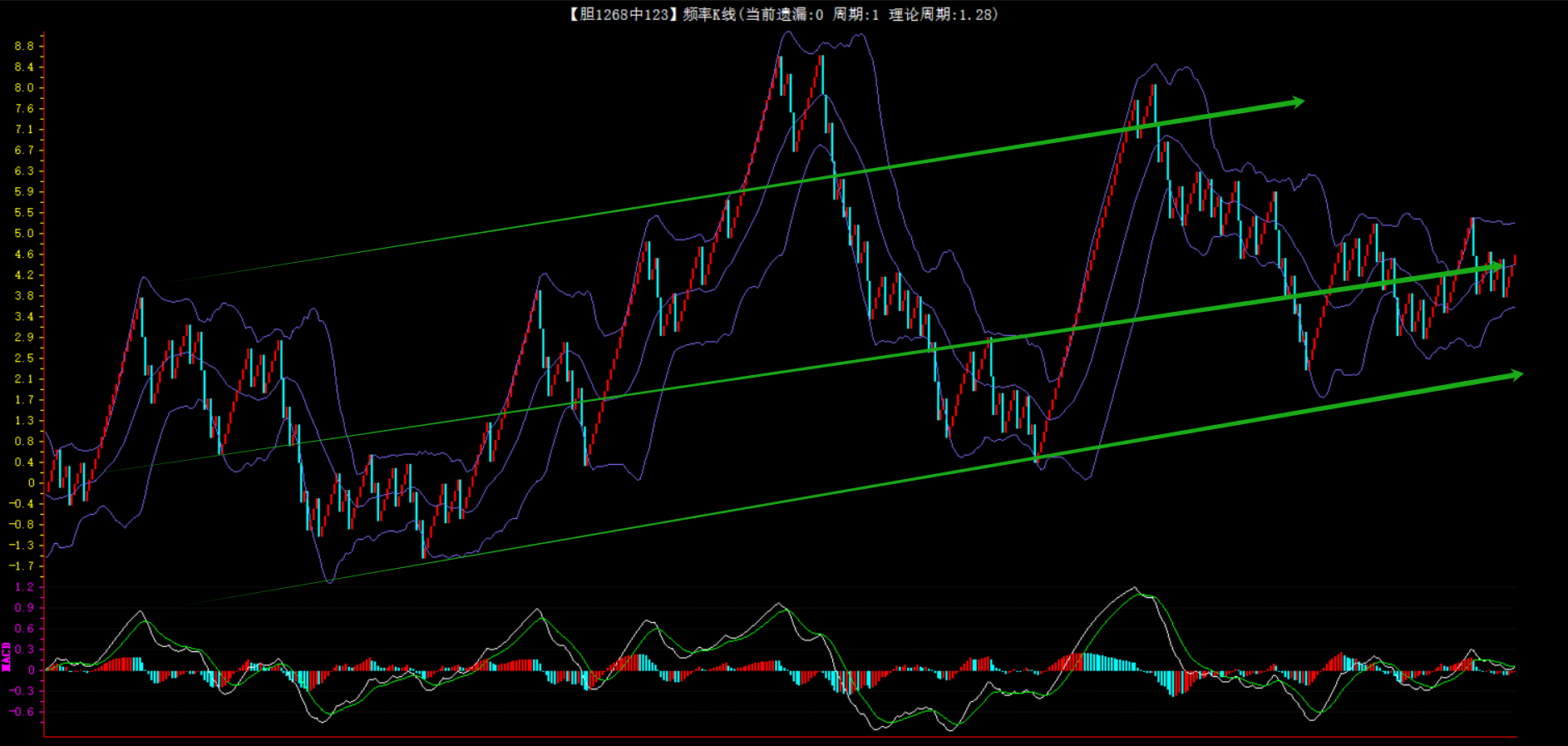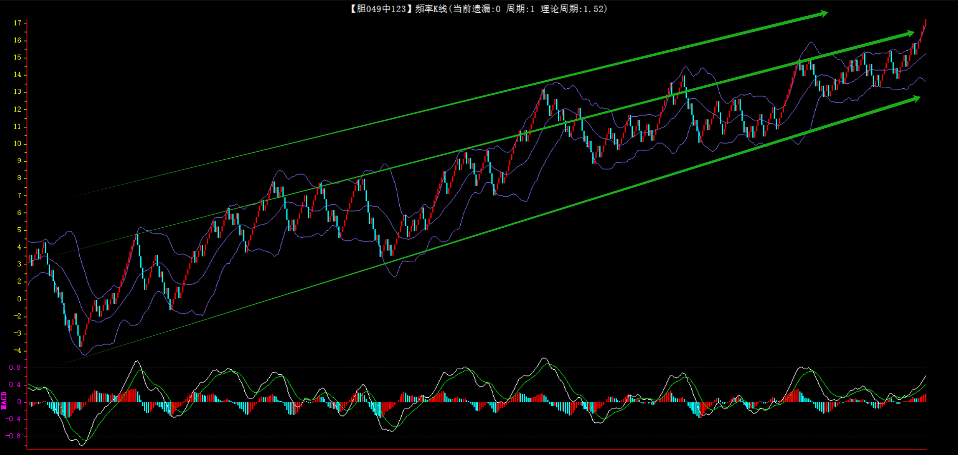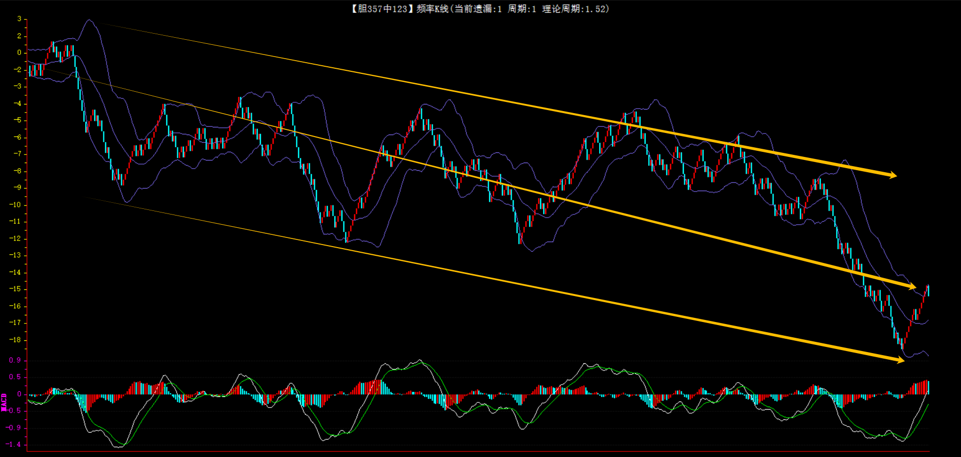 整体趋势下行,上边沿线趋势向下,下边沿趋势也是向下,节点震荡,当前遗漏1期,本期防守。