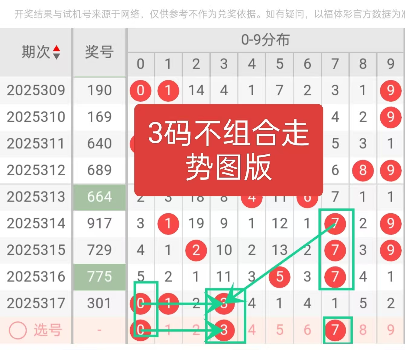 2025317期奖号3,0,1,和值4,跨度3,大小比1:2,奇偶比2:1。近期奖号偏小,关注反弹。