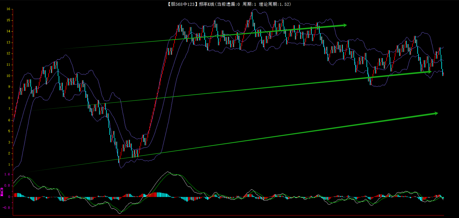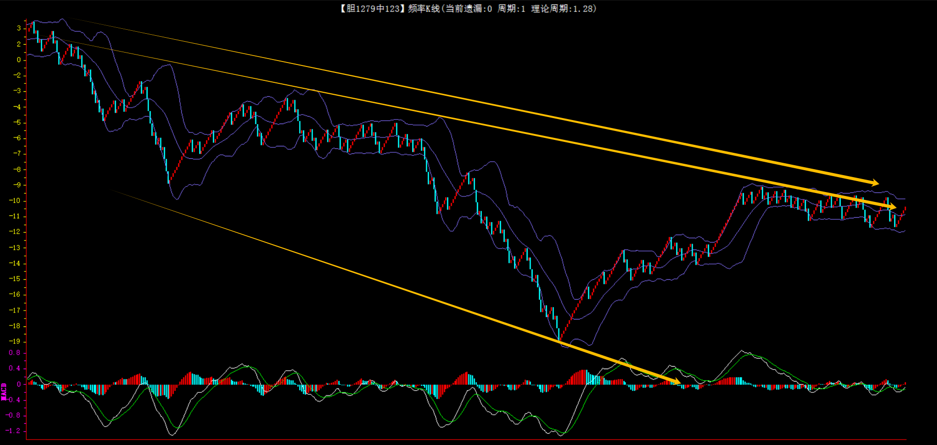 整体趋势下行,上边沿线趋势向下,下边沿趋势也是向下,节点震荡,当前连开6期,本期防守。