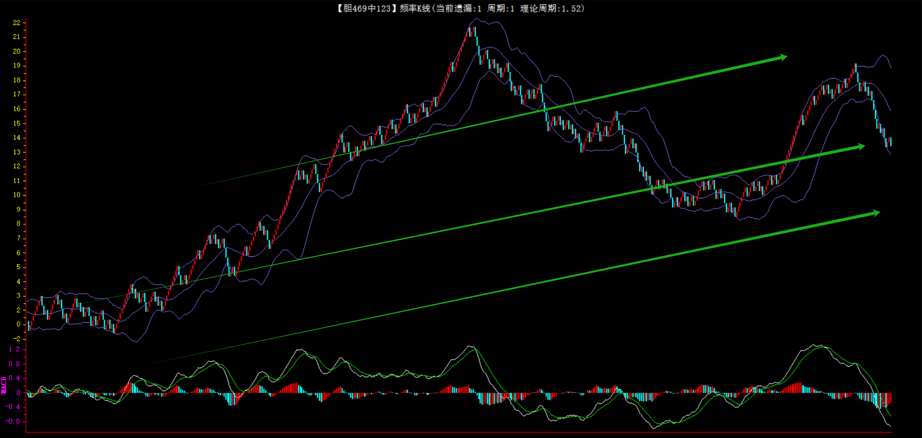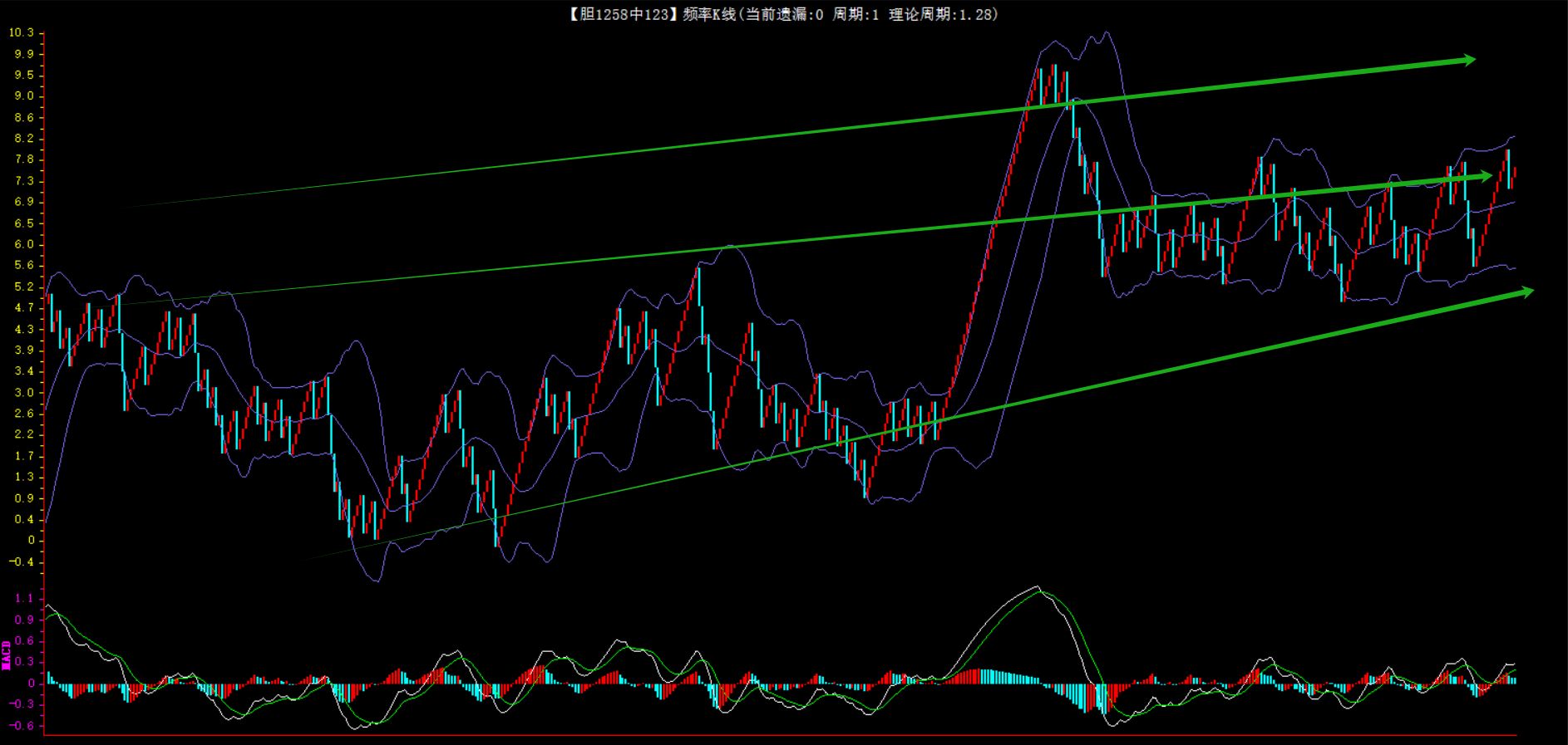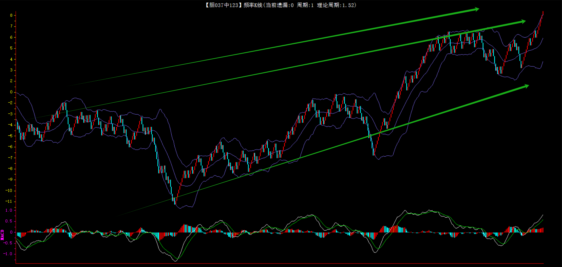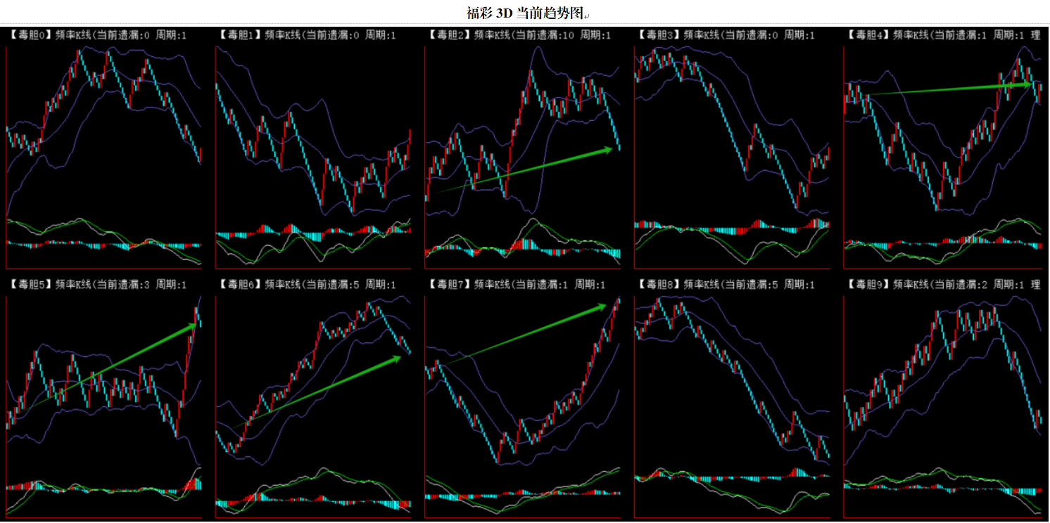 整体趋势上行,上边沿线趋势向上,下边沿趋势也是向上,节点震荡,当前遗漏1期,本期关注。