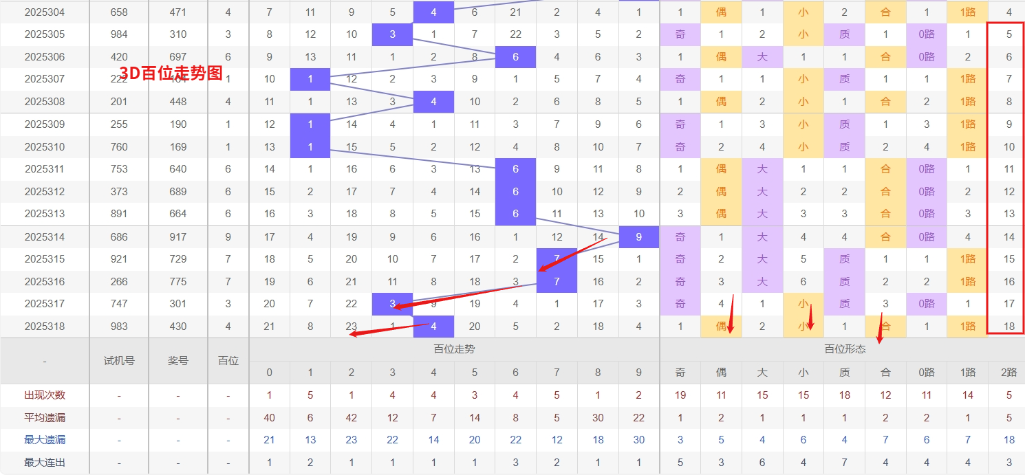 福彩3D百位分析:第2025318期百位开出号码4属于小偶数,从上面百位走势图上可以看出近100期大小比约为51:49奇偶比约为47:53。近期数据还是比较极端的符合文章开头介绍的求均衡规律非等量现象。但这种均衡不会持续最终会被偏态运行打破,然后循环往复。但短期内大小相差1点,大数过热小数有回补需求本期个人认为走小数的概率更高。上期百位落号“4”号球,在百位号码开出1路号码4后向大数方向走出1个振幅。那么通过分析上期百位落位号码分析,号码走出1个振幅,号码走为小偶数,开出1路号码4。通过对百位落号趋势来分析,百位号码落位前端,通过对近10期的走势来看百位号码大小交替频繁走2期大数又走3小数,近期3D百位走势分析,目前呈现出明显的冷热分化态势。其中,数字0和8在百位上遗漏期数较长,已进入冷号区间,按照概率回补的规律,这种长期缺失的状态难以持续,其解冻和开出的可能性正随着遗漏值的增加而不断增大,近期需要作为重点对象密切关注其回补动态。与此同时,数字1在百位则表现出强劲的热出势头,形成了清晰的热号趋势,这种热度往往具有一定的惯性,在重点关注冷号回补的同时,对热号1的持续开出保持高度警惕,我们在百位关注的重点在01268这5个号码球上,百位号码近期奇偶切换频繁,4号球码属于1路号码偶数,现偶数开出过多有继续向偶数的趋势。所以福彩3D第2025319期百位看好01268。