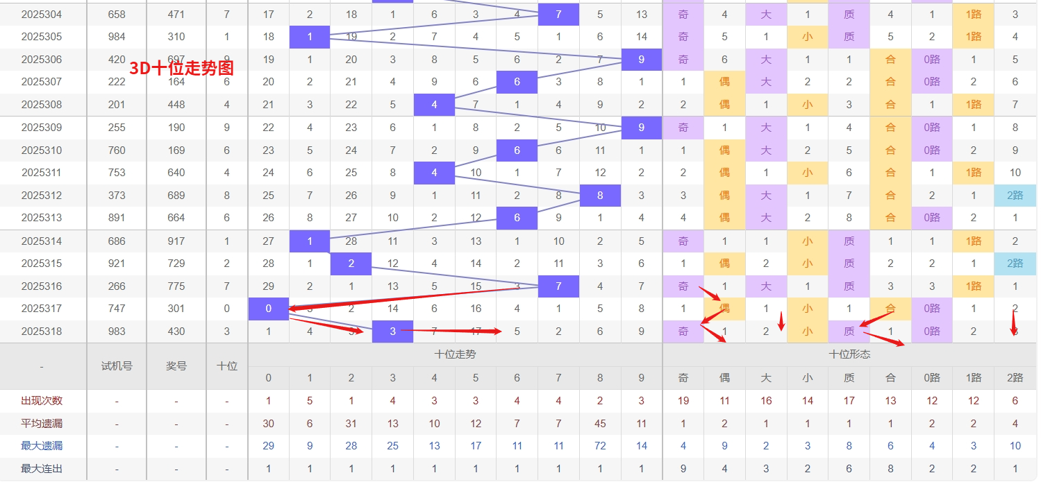 福彩3D十位分析:第2025318期十位开出号码3属小奇数号码前端。以历史100期数据为例十位奇偶比约为53比47,大小比约为55比45近期大小相差3点,根据求均衡的规律开出小数的概率比大数高一点。上期我们分析偶数经过连续回补后有走奇数的可能,开出奖号3小奇数符合我们的预期。根据近期3D十位走势来看,盘面热度分布较为清晰:数字1和7作为当前最活跃的热号,其连续开出的态势展现了强大的热出惯性,这种强势短期内通常难以迅速中断,重点防范其可能出现的“连下”现象。与此同时,数字4和5作为温号,在走势中已经显示出一定的活跃度与转暖迹象,它们正处于从温态向热态过渡的关键阶段,这类号码往往是下一阶段的热门备选,在紧跟热号1和7的连下趋势的同时,也要对温号4和5的转热迹象保持高度警觉,所以福彩3D第2025319期十位推荐14579。