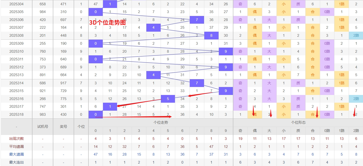 福彩3D个位分析:第2025318期个位开出号码0属于小偶数前端,从以上个位走势图中可以看出近100期的大小比约为46:54奇偶比约为52:48大小奇偶数据上有点差异有需求但不是太明显,不太好看这时就要借助连线走势和遗漏数据来帮助我们缩水号码。上期个位落号“0”小偶数0路号码球,号码开出了1振幅,连续多期的大振必被小振幅取代幅符合我们的预期,那么本期我们在个位考虑振幅走势走前依然要转变思路考虑大振幅,具体考虑(1-5)个振幅是我们主要的方向,那么在对个位落号情况进行系统的分析时我们可以明显的看到个位号码走势呈现大范围震荡,尤其是在号码的落位特点上表现的尤为突出,那么本期我们在个位分析时就要注意号码的风险,避免出现踏空。近期3D个位走势分析,盘面呈现出冷热并存的典型特征。其中,数字2和6在个位上的遗漏值已进入较深区间,作为备受关注的冷号,按照“冷极必热”的走势规律,其积压已久的回补动能正不断增强,近期解冻开出的可能性非常大,应当将其视为重点追踪目标。与此同时,数字7在个位则展现出强劲的热出势头,形成了明确的热号态势,这种热度通常具备一定的惯性,对热号7的持续延伸严加防范。因此,最合理的策略是采取“冷热兼顾”的思路,在重点关注冷号2和6实现回补的同时,也绝不放松对热号7再次开出的警惕,因此福彩3D第2025319期个位看好23679。
