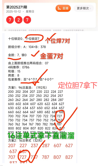 首先来看上期开奖号码为:727,和值为16,上期推荐金胆7且焊在个位正确,16注单式拿下727直选等。