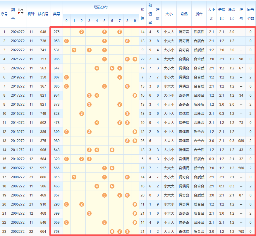 1、统计往年同期开奖号码