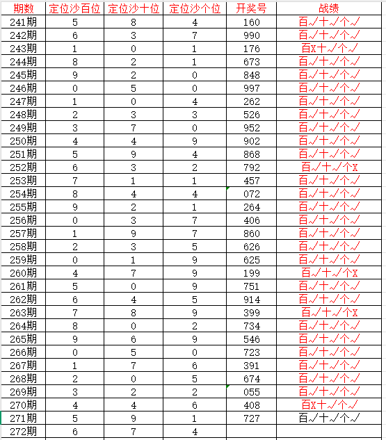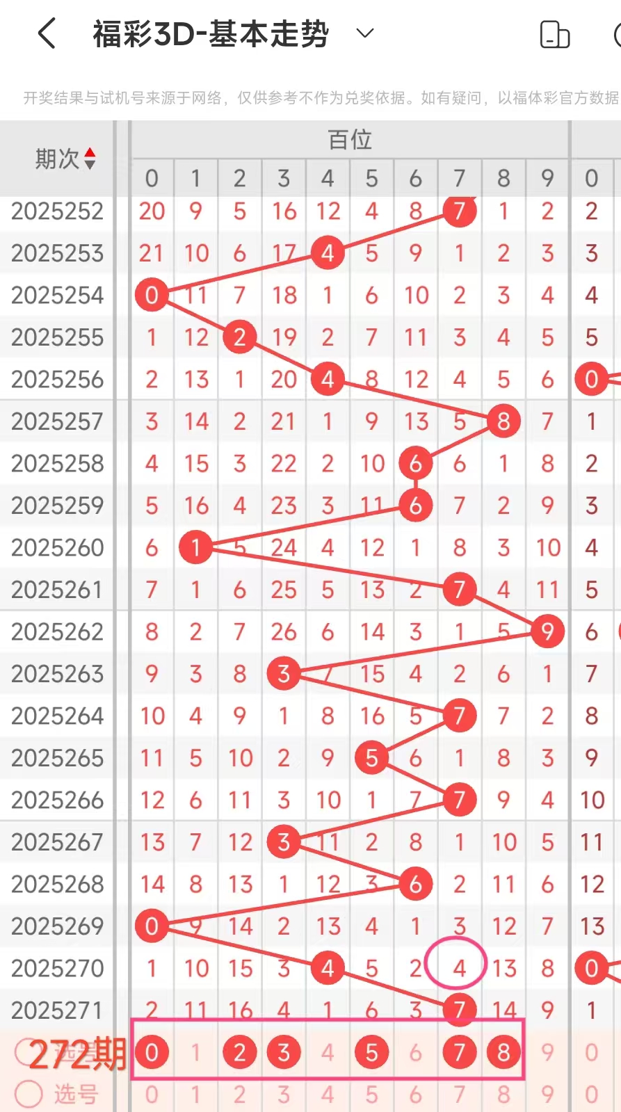 我们选取上期开奖号码727、在彩虹多多APP上截取前100期的数据,分别记录当开出百7、十2、个7、后下期开出什么号记录下来,然后一一分析。